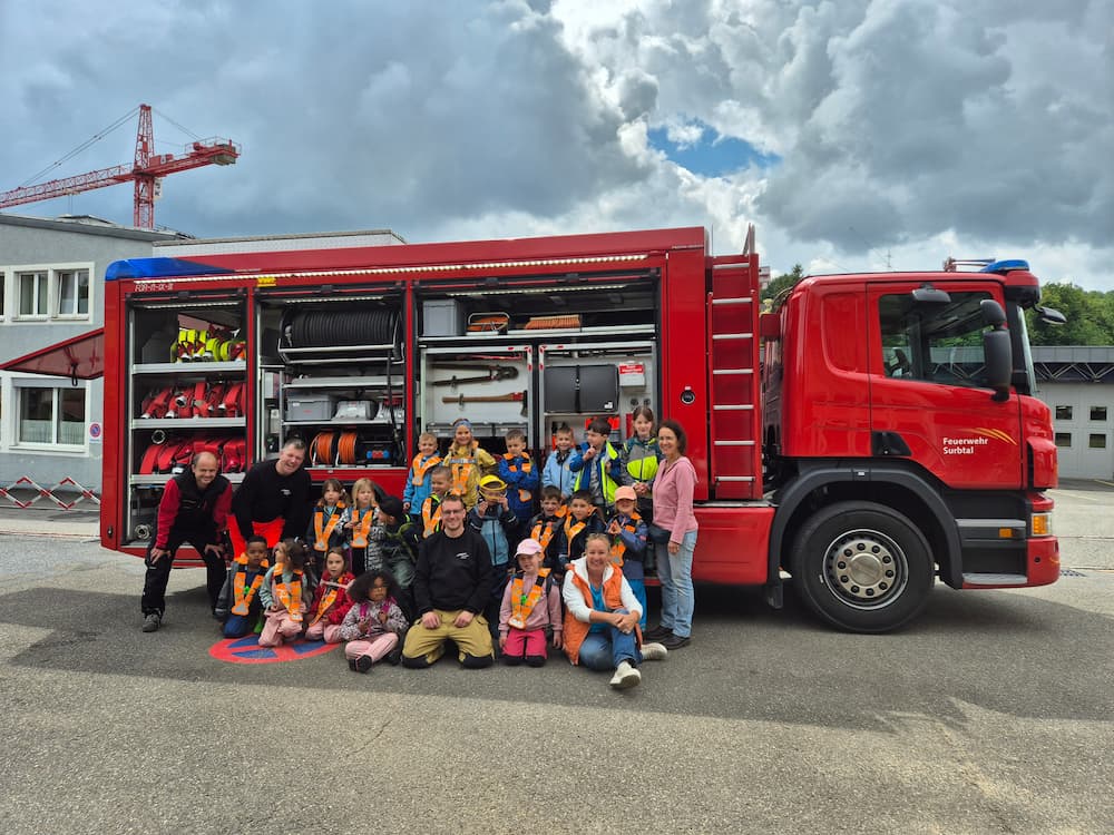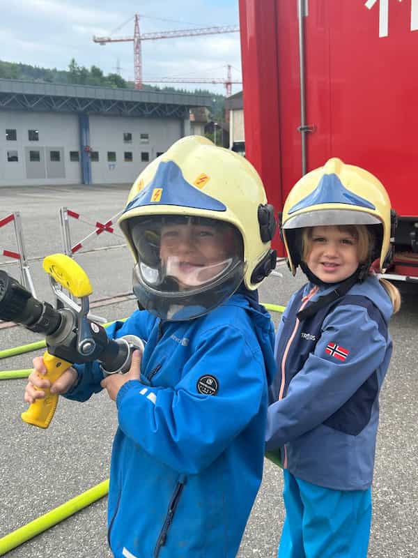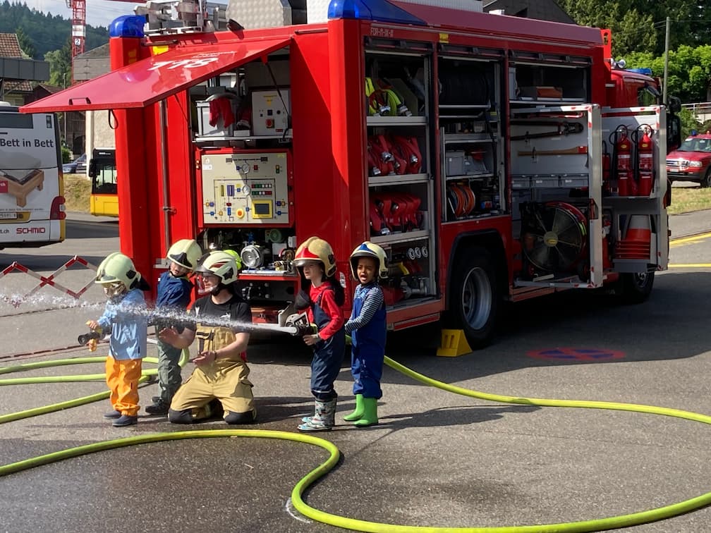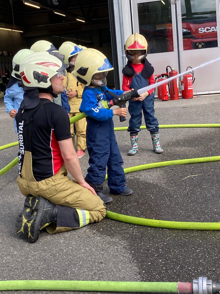 Herr Müller, Herr Eichholzer und Herr Hauenstein von der Feuerwehr Surbtal begrüssten die fröhliche Schar. An drei spannenden Posten zeigten und erklärten sie den Kindergartenkindern mit viel Herzblut verschiedene Arbeiten der Feuerwehr. Vieles durften die Kinder, wie auch ihre Begleiterinnen auch gleich selber ausprobieren. Es war sehr interessant und spannend es hat allen Kindern sehr viel Freude bereitet.