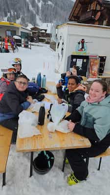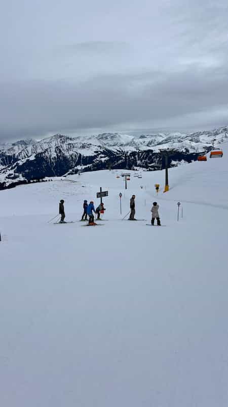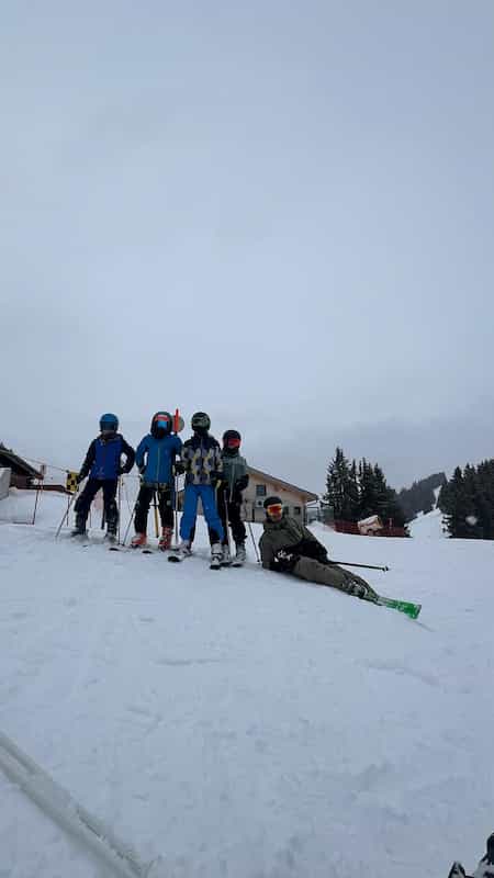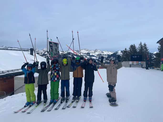 Am Montag ging es dann das erste Mal auf die Piste. Lange warteten wir auf unseren reservierten Skibus, welcher uns aber leider vergessen hat. So mussten wir auf den nächsten regulären Linienbus warten. Die Snowboard- und Skianfänger stiegen eine Haltestelle früher aus, da sie die ersten Tage auf dem Anfängerhügel fuhren. Die Kinder, welche das allererste Mal auf den Skiern und dem Board standen, übten sich zuerst auf dem Zauberteppich. Es war eindrücklich zu beobachten, mit welchem Ehrgeiz sie die neuen Herausforderungen wie Skilift, erste Kurven und Bremsen annahmen und bereits alle nach dem dritten Tag mit dem Tellerlift ganz nach oben fahren konnten.