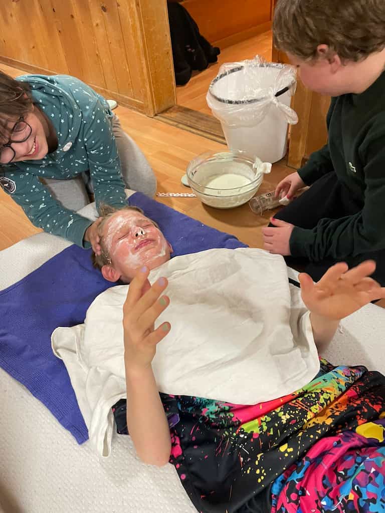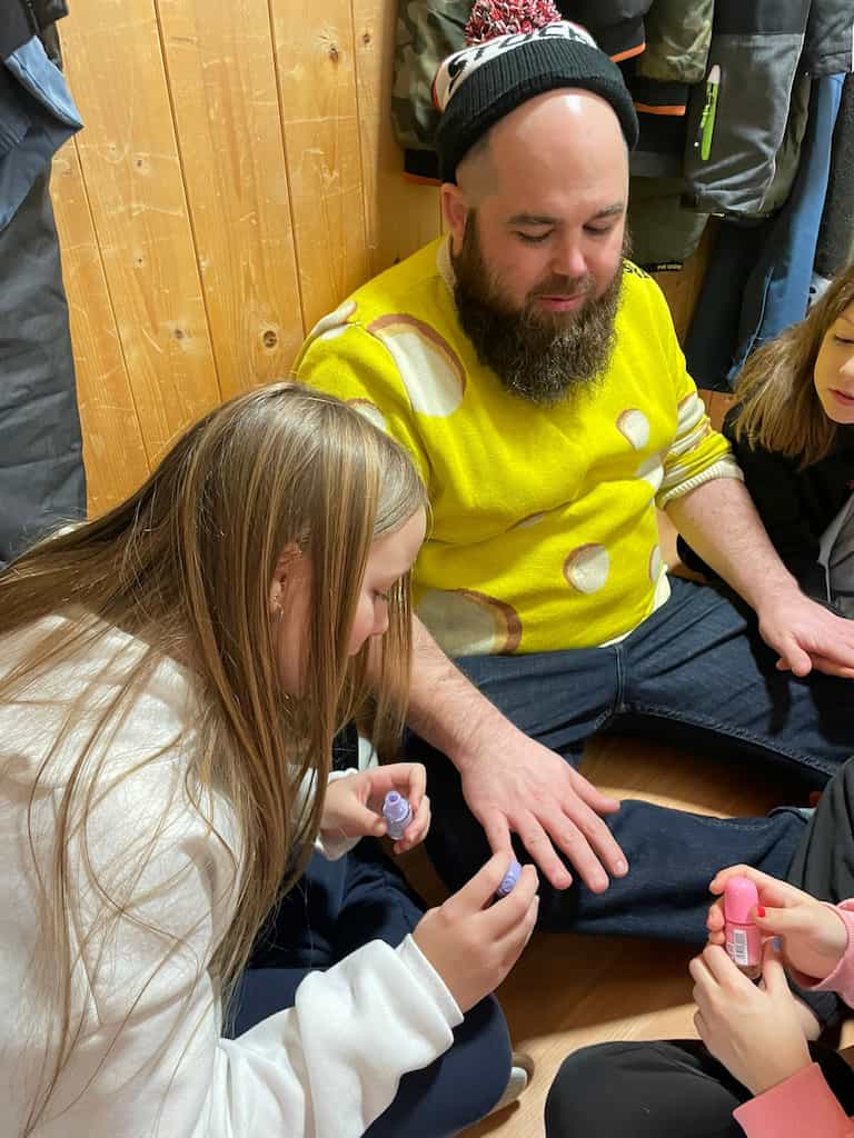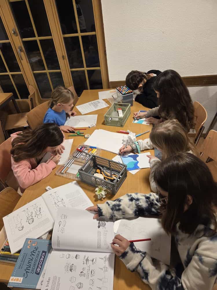 Da für den Mittwoch den ganzen Tag Schneefall angesagt war, beschlossen die Leiter, am Nachmittag mit der Lagerbande ins Hallenbad zu gehen. Es wurde geplanscht und «geblubbert», einige Kinder zeigten ihre Kunststücke auf dem Sprungbrett und flitzen die Rutschbahn runter. Nicht alle Kinder wollten ins Hallenbad, sodass sich einige weiter auf den Pisten aufhielten. Da die Sicht aber nicht so gut war, kamen viele etwas früher zum Lagerhaus und fuhren dort am hauseigenen Skilift weiter. Am Abend gab es für die Kinder verschiedene Stationen mit Unterhaltungs- sowie Spiel- und Wellness- Angeboten, welche sie besuchen durften. Ob beim «Bändeli knüpfen», beim Handlettering, in die Wellnessoase eintauchen und beim Fingernägel lackieren oder einer Gesichtsmaske entspannen, bei einer Runde Black-Jack, bei Spiel und Spass im Schnee oder beim Rundlauf am Tischtennistisch, die Kinder genossen diese tollen Angebote, sie durften an den Stationen so lange verweilen, wie sie mochten.